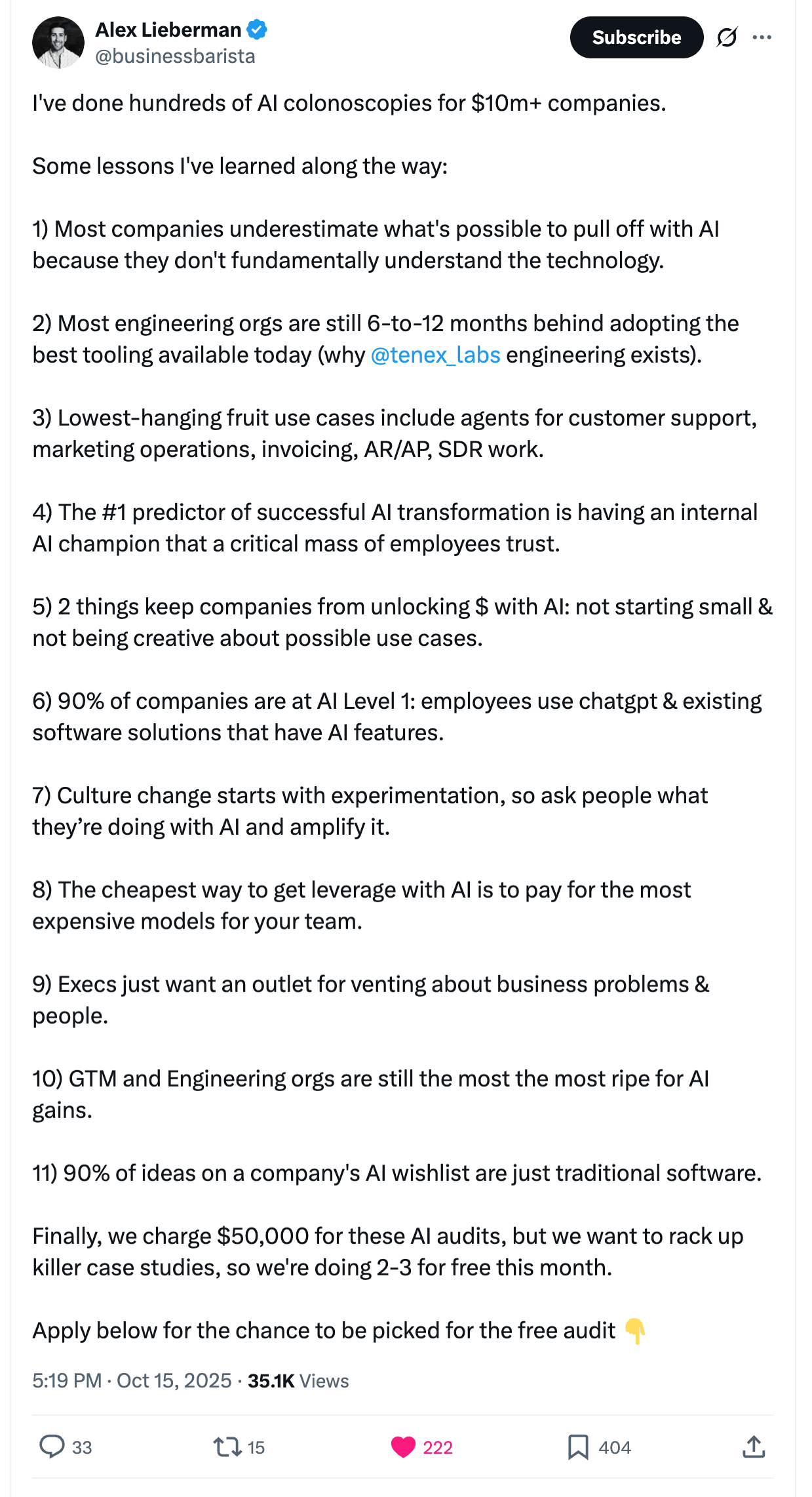 Here is a post from Alex Lieberman, he is famous for selling his business newsletter, Morning Brew for $75M. Now he is building an AI consultancy - Tenex.